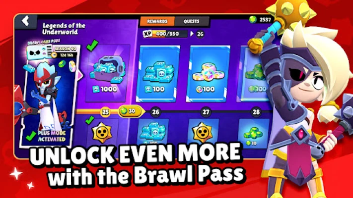 Turpiniet savu ceļu uz slavu, pelnot trofejas un atbloķējot bagātīgas atlīdzības ar katras sezonas "Brawl Pass". Iegūstiet dārgakmeņus, spēka punktus, piespraudes un ekskluzīvus "Starr Drops", kas atsvaidzina jūsu spēles pieredzi. Izcelieties globālajos un lokālajos līderu sarakstos, pierādot savas MOBA prasmes pret spēlētājiem visā pasaulē. Apvienojieties vai izveidojiet savu klubu ar citiem spēlētājiem, lai kopīgi dalītos padomos un cīnītos. "Brawl Stars" nepārtraukti attīstās, piedāvājot jaunus Bravierus, izskatus, kartes, īpašus notikumus un spēles režīmus, tostarp ikdienas PvP izaicinājumus un spēlētāju veidotas kartes. Šī pasaule ir vienmēr mainīga un pilna ar pārsteigumiem!