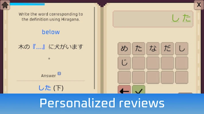 Dodieties aizraujošā ceļojumā pa reālām Japānas pilsētām, iepazīstoties ar kultūru un praktiskām sarunām. Iemācieties iepazīstināt sevi, pasūtīt ēdienu, jautāt ceļu vietējiem iedzīvotājiem un atklājiet slēptus noslēpumus. Savāciet jaunus vārdus, Kana un Kanji simbolus, kā arī saņemiet detalizētus gramatikas noteikumu un konjugācijas skaidrojumus soli pa solim. Atvadieties no garlaicīgiem sarakstiem un ienirstiet valodā, ko atbalsta interaktīva vārdnīca, saprotami gramatikas skaidrojumi un autentiski, pilnībā ieskaņoti dialogi. Lai pārbaudītu savas zināšanas, izaiciet japāņu lielmeistarus viņu pilīs un sacentieties ar citiem valodas apguvējiem Kana un Kanji minispēlēs, ierindojot savus rezultātus labāko sarakstā.